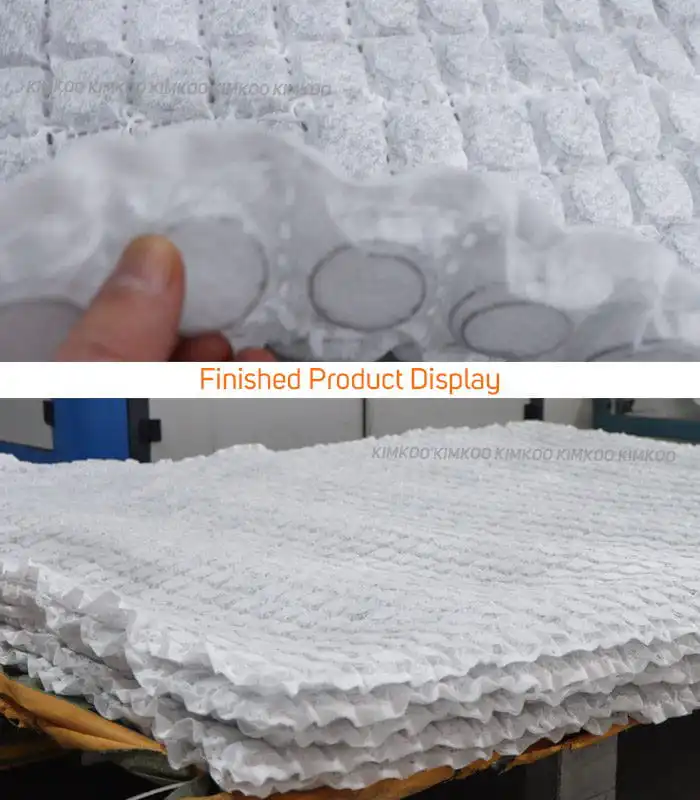 Пружинные подушки, изготовленные на этом станке, полностью состоят из высокопрочной нетканой ткани DuPont и высокоуглеродистой стальной проволоки, соединенных методом ультразвуковой сварки без использования клеевых составов. Это обеспечивает экологичность, гигиеничность, воздухопроницаемость и безопасность при длительной эксплуатации. Подушки обеспечивают многоточечную поддержку, повторяя контуры тела, гарантируя высокую упругость, комфорт и долговечность. Каждая подушка выдерживает до 30 000 циклов нагрузки без деформации или разрушения.